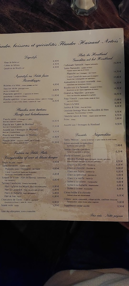 Guests are greeted with warm, friendly service in a rustic atmosphere adorned with charming antique decor. The menu features local specialties like carbonnade flamande and flamiche tarte, each dish showcasing high-quality, uncomplicated ingredients that celebrate the heart of Flemish culture. Experience the delightful Anosteké beer, perfectly paired with decadent chocolate-speculoos slices that leave a lasting impression.